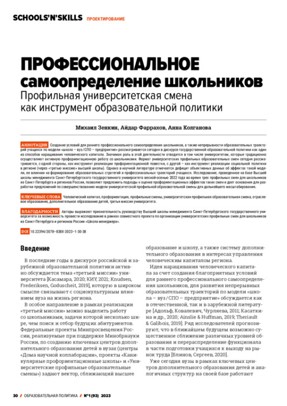 Создание условий для раннего профессионального самоопределения школьников, а также непрерывности образовательных траекторий учащихся по модели «школа - вуз / СПО - предприятие» рассматривается сегодня в дискурсе государственной образовательной политики как один из способов наращивания человеческого капитала. Значимая роль в этой деятельности отводится в том числе университетам, которые традиционно осуществляют активную профориентационную работу со школьниками. Формат университетских профильных образовательных смен сегодня рассматривается, с одной стороны, как инструмент реализации профориентационной повестки, с другой - как инструмент реализации социальной политики в регионе (через «третью миссию» высшей школы). Однако в научной литературе отмечается дефицит объективных данных об эффектах такой модели, ее влиянии на формирование образовательных стратегий и профессиональных траекторий учащихся. Исследование, проведенное на базе Высшей школы менеджмента Санкт-Петербургского государственного университета весной-осенью 2022 года во время трех профильных смен для школьников из Санкт-Петербурга и регионов России, позволяет предложить подходы к оценке профориентационных эффектов таких смен и дает основания для разработки предложений по совершенствованию модели университетской профильной образовательной смены для дальнейшего масштабирования.