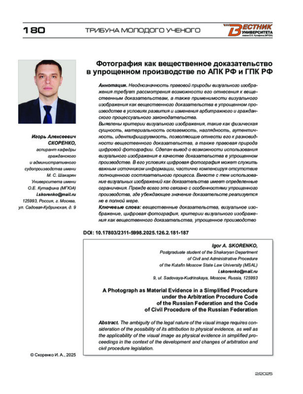 Неоднозначность правовой природы визуального изображения требует рассмотрения возможности его отнесения к вещественным доказательствам, а также применимости визуального изображения как вещественного доказательства в упрощенном производстве в условиях развития и изменения арбитражного и гражданского процессуального законодательства. Выявлены критерии визуального изображения, такие как физическая сущность, материальность осязаемость, наглядность, аутентичность, идентифицируемость, позволяющие отнести его к разновидности вещественного доказательства, а также правовая природа цифровой фотографии. Сделан вывод о возможности использования визуального изображения в качестве доказательства в упрощенном производстве. В его условиях цифровая фотография может служить важным источником информации, частично компенсируя отсутствие полноценного состязательного процесса. Вместе с тем использование визуальных изображений как доказательства имеет определенные ограничения. Прежде всего это связано с особенностями упрощенного производства, где убеждающее значение доказательств реализуется не в полной мере.