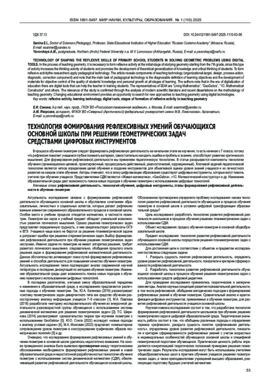 Статья: ТЕХНОЛОГИЯ ФОМИРОВАНИЯ РЕФЛЕКСИВНЫХ УМЕНИЙ ОБУЧАЮЩИХСЯ ОСНОВНОЙ ШКОЛЫ ПРИ РЕШЕНИИ ГЕОМЕТРИЧЕСКИХ ЗАДАЧ СРЕДСТВАМИ ЦИФРОВЫХ ИНСТРУМЕНТОВ