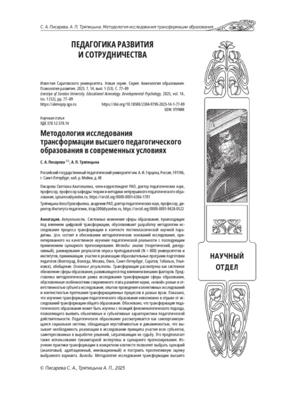 Статья: МЕТОДОЛОГИЯ ИССЛЕДОВАНИЯ ТРАНСФОРМАЦИИ ВЫСШЕГО ПЕДАГОГИЧЕСКОГО ОБРАЗОВАНИЯ В СОВРЕМЕННЫХ УСЛОВИЯ