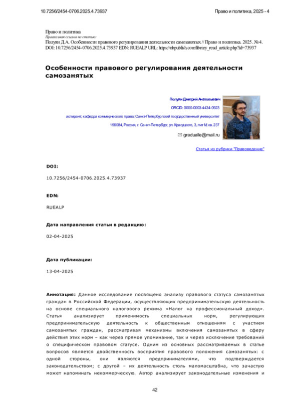 Данное исследование посвящено анализу правового статуса самозанятых граждан в Российской Федерации, осуществляющих предпринимательскую деятельность на основе специального налогового режима «Налог на профессиональный доход». Статья анализирует применимость специальных норм, регулирующих предпринимательскую деятельность к общественным отношениям с участием самозанятых граждан, рассматривая механизмы включения самозанятых в сферу действия этих норм - как через прямое упоминание, так и через исключение требований о специфическом правовом статусе. Одним из основных рассматриваемых в статье вопросов является двойственность восприятия правового положения самозанятых: с одной стороны, они являются предпринимателями, что подтверждается законодательством; с другой - их деятельность столь маломасштабна, что зачастую может напоминать некоммерческую. Автор анализирует законодательные изменения и обосновывает необходимость дифференцированного подхода к применению отдельных норм предпринимательского права к самозанятым. Методологию исследования составили общий диалектический метод познания, общенаучные методы познания: формальная логика, сравнение, обобщение, аналогия, анализ и синтез, а также частнонаучные методы познания: юридико-догматический метод, метод юридической герменевтики (метод интерпретации правовых норм). Актуальность статьи обусловлена тем, что неопределённость правового статуса самозанятых в совокупности с отсутствием однозначной интерпретации их деятельности в качестве предпринимательской порождает проблему определения применимых к их коммерческой деятельности норм. Данная проблема нашла свое отражение во множественной судебной практике и юридической литературе, однако не получила своего решения. Новизна исследования заключается в том, что оно анализирует эту проблему, предлагая конкретные решения по корректировке законодательства, что повысит ясность правовой квалификации и эффективность правоприменения. Основные выводы исследования заключаются в следующем. Несмотря на законодательное признание предпринимательского характера деятельности самозанятых, существующая правовая неопределенность требует корректировки. Для обеспечения равноправного участия самозанятых в экономических отношениях предлагается распространить на них нормы, регулирующие деятельность других предпринимателей, с учётом существующих ограничений деятельности плательщиков налога на профессиональный доход и объемов их деятельности. Для повышения правовой ясности необходимо дополнить ст. 2 Закона № 422-ФЗ нормой, прямо декларирующей предпринимательский характер деятельности самозанятых, и переименовать налоговый режим в “Налог на малый предпринимательский доход”.