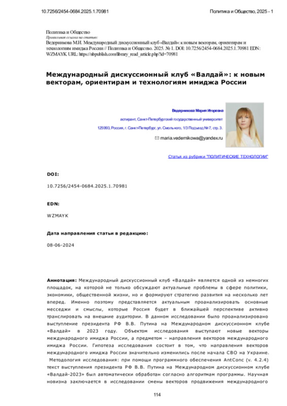 Статья: Международный дискуссионный клуб «Валдай»: к новым векторам, ориентирам и технологиям имиджа России