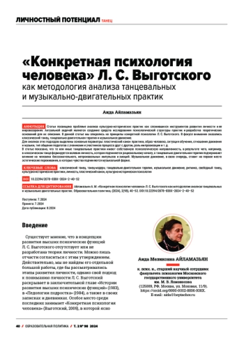 Статья: "КОНКРЕТНАЯ ПСИХОЛОГИЯ ЧЕЛОВЕКА" Л. С. ВЫГОТСКОГО КАК МЕТОДОЛОГИЯ АНАЛИЗА ТАНЦЕВАЛЬНЫХ И МУЗЫКАЛЬНОДВИГАТЕЛЬНЫХ ПРАКТИК