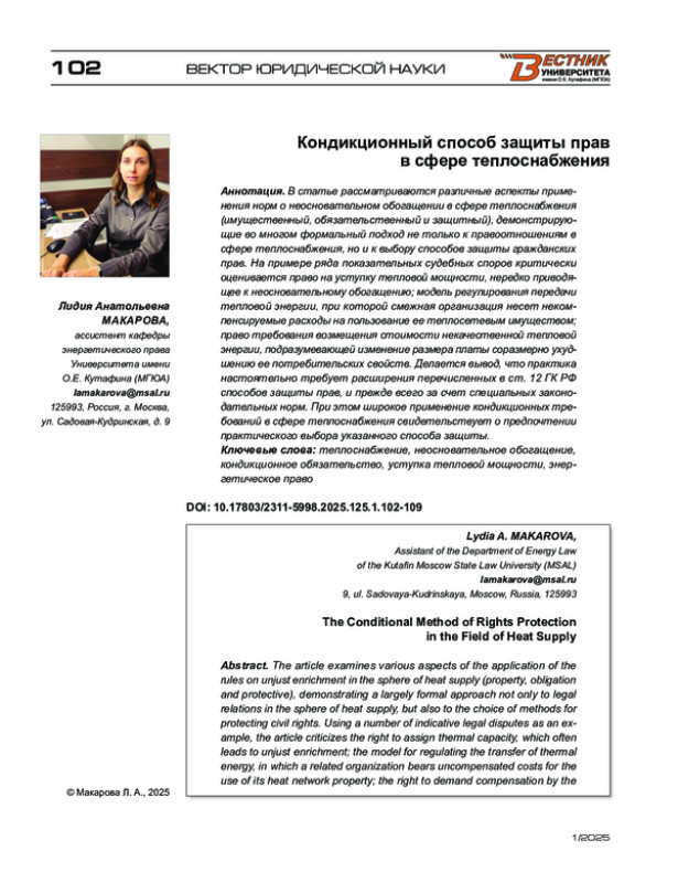 В статье рассматриваются различные аспекты применения норм о неосновательном обогащении в сфере теплоснабжения (имущественный, обязательственный и защитный), демонстрирующие во многом формальный подход не только к правоотношениям в сфере теплоснабжения, но и к выбору способов защиты гражданских прав. На примере ряда показательных судебных споров критически оценивается право на уступку тепловой мощности, нередко приводящее к неосновательному обогащению; модель регулирования передачи тепловой энергии, при которой смежная организация несет некомпенсируемые расходы на пользование ее теплосетевым имуществом; право требования возмещения стоимости некачественной тепловой энергии, подразумевающей изменение размера платы соразмерно ухудшению ее потребительских свойств. Делается вывод, что практика настоятельно требует расширения перечисленных в ст. 12 ГК РФ способов защиты прав, и прежде всего за счет специальных законодательных норм. При этом широкое применение кондикционных требований в сфере теплоснабжения свидетельствует о предпочтении практического выбора указанного способа защиты.