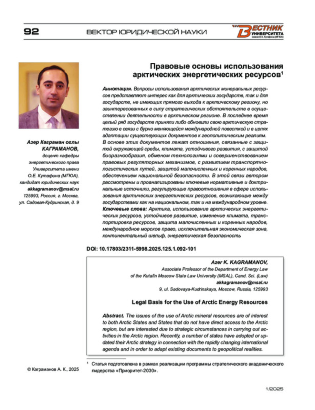 Вопросы использования арктических минеральных ресурсов представляют интерес как для арктических государств, так и для государств, не имеющих прямого выхода к арктическому региону, но заинтересованных в силу стратегических обстоятельств в осуществлении деятельности в арктическом регионе. В последнее время целый ряд государств приняли либо обновили свою арктическую стратегию в связи с бурно меняющейся международной повесткой и в целях адаптации существующих документов к геополитическим реалиям. В основе этих документов лежат отношения, связанные с защитой окружающей среды, климата, устойчивого развития, с защитой биоразнообразия, обменом технологиями и совершенствованием правовых регуляторных механизмов, с развитием транспортно-логистических путей, защитой малочисленных и коренных народов, обеспечением национальной безопасности. В этой связи автором рассмотрены и проанализированы ключевые нормативные и доктринальные источники, регулирующие правоотношения в сфере использования арктических энергетических ресурсов, возникающие между государствами как на национальном, так и на международном уровне.