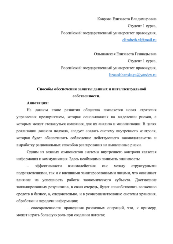 Под данными, которыми располагает экономический субъект, может пониматься различного рода информация, одним из основных требований к качеству которой является защищенность, то есть обеспечение отсутствия возможности утечки информации и ее несогласованного изменения.