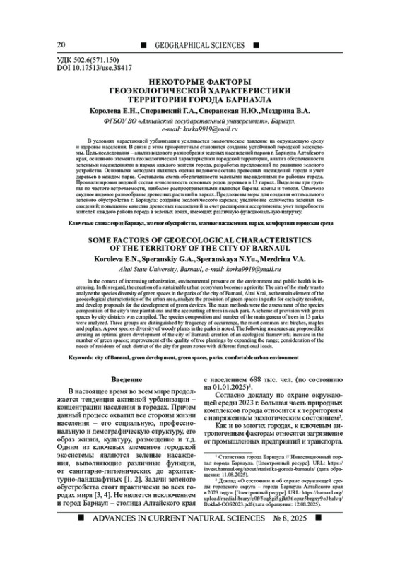 Статья: НЕКОТОРЫЕ ФАКТОРЫ ГЕОЭКОЛОГИЧЕСКОЙ ХАРАКТЕРИСТИКИ ТЕРРИТОРИИ ГОРОДА БАРНАУЛА