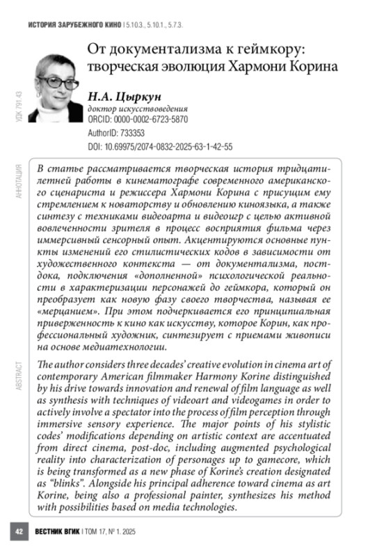В статье рассматривается творческая история тридцатилетней работы в кинематографе современного американского сценариста и режиссера Хармони Корина с присущим ему стремлением к новаторству и обновлению киноязыка, а также синтезу с техниками видеоарта и видеоигр с целью активной вовлеченности зрителя в процесс восприятия фильма через иммерсивный сенсорный опыт. Акцентируются основные пункты изменений его стилистических кодов в зависимости от художественного контекста — от документализма, постдока, подключения «дополненной» психологической реальности в характеризации персонажей до геймкора, который он преобразует как новую фазу своего творчества, называя ее «мерцанием». При этом подчеркивается его принципиальная приверженность к кино как искусству, которое Корин, как профессиональный художник, синтезирует с приемами живописи на основе медиатехнологии.