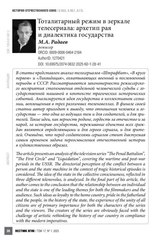 Статья: Тоталитарный режим в зеркале телесериала: архетип рая и диалектика государства