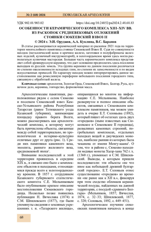 Статья: ОСОБЕННОСТИ КЕРАМИЧЕСКОГО КОМПЛЕКСА XIII-XIV ВВ. ИЗ РАСКОПОК СРЕДНЕВЕКОВЫХ ОТЛОЖЕНИЙ СТОЯНКИ СЮКЕЕВСКИЙ ВЗВОЗ II
