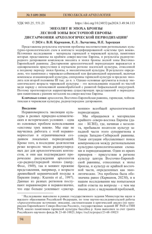 Статья: ЭНЕОЛИТ И ЭПОХА БРОНЗЫ ЛЕСНОЙ ЗОНЫ ВОСТОЧНОЙ ЕВРОПЫ: ДИСГАРМОНИЯ АРХЕОЛОГИЧЕСКОЙ ПЕРИОДИЗАЦИИ