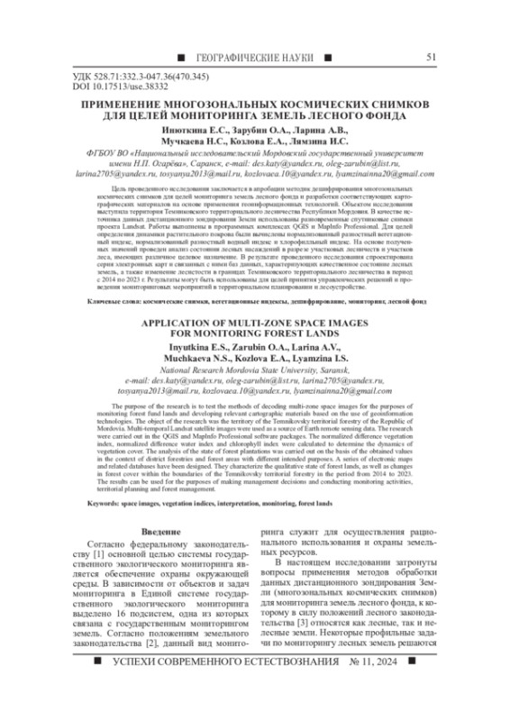 Статья: ПРИМЕНЕНИЕ МНОГОЗОНАЛЬНЫХ КОСМИЧЕСКИХ СНИМКОВ ДЛЯ ЦЕЛЕЙ МОНИТОРИНГА ЗЕМЕЛЬ ЛЕСНОГО ФОНДА