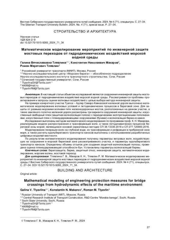 В настоящей статье объектом исследований являются сооружения инженерной защиты мостовых переходов от гидродинамических воздействий морской водной среды. Рассматриваются проблемы проектирования и вопросы оценки волновых воздействий с целью выбора метода инженерной защиты. На примере конкретного участка Туапсе - Адлер Северо-Кавказской железной дороги выполнено математическое моделирование волновых условий и литодинамических процессов в береговой зоне. Для защиты от размыва морскими волнами пяти железнодорожных мостов, расположенных на данном участке, а также земляного полотна железной дороги рассмотрены три варианта сооружений инженерной защиты: искусственный свободный пляж (защитная волногасящая полоса) с периодическими эксплуатационными пополнениями, искусственный пляж с пляжеудерживающими сооружениями (бунами) и волногасящая берма из камня.