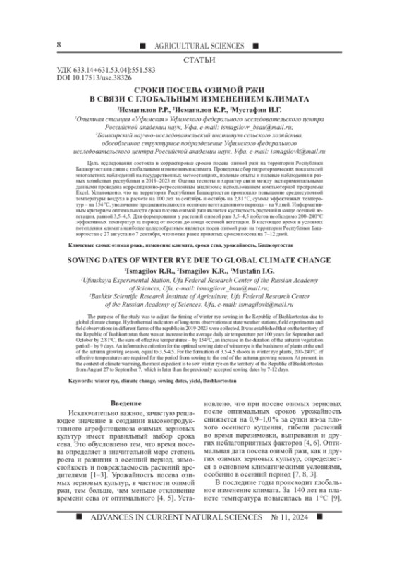 Цель исследования состояла в корректировке сроков посева озимой ржи на территории Республики Башкортостан в связи с глобальными изменениями климата. Проведены сбор гидротермических показателей многолетних наблюдений на государственных метеостанциях, полевые опыты и полевые наблюдения в разных хозяйствах республики в 2019-2023 гг. Оценка тесноты и характер связи между экспериментальными данными проведена корреляционно-регрессионным анализом с использованием компьютерной программы Excel. Установлено, что на территории Республики Башкортостан произошло повышение среднесуточной температуры воздуха в расчете на 100 лет за сентябрь и октябрь на 2,81 °С, суммы эффективных температур - на 154 °С, увеличение продолжительности осеннего вегетационного периода - на 9 дней. Информативным критерием оптимальности срока посева озимой ржи является кустистость растений в конце осенней вегетации, равной 3,5-4,5. Для формирования у растений озимой ржи 3,5-4,5 побегов необходимо 200-240 ºС эффективных температур за период от посева до конца осенней вегетации. В настоящее время в условиях потепления климата наиболее целесообразным является посев озимой ржи на территории Республики Башкортостан с 27 августа по 7 сентября, что позже ранее принятых сроков посева на 7-12 дней.