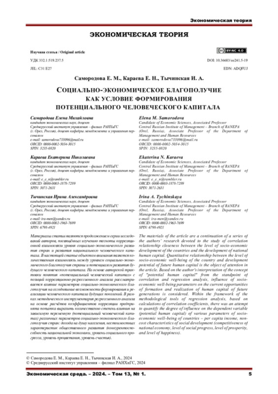 Материалы статьи являются продолжением серии исследований авторов, посвящённых изучению тесноты корреляционной взаимосвязи уровня социально-экономического развития стран и развития национального человеческого капитала. В настоящей статье объектом внимания является количественная взаимосвязь между уровнем социально-экономического благополучия страны и потенциалом развития будущего человеческого капитала. На основе авторской трактовки понятия «потенциальный человеческий капитал» с позиций корреляционно-регрессионного анализа рассматривается влияние параметров социально-экономического благополучия на сегодняшние возможности формирования и реализации человеческого капитала будущих поколений. В рамках методического инструментария регрессионного анализа на основе расчётов коэффициентов корреляции предпринята попытка выразить количественно степень влияния на зависимую переменную (потенциальный человеческий капитал) различных параметров социально-экономического благополучия стран: дохода на душу населения, нестоимостных характеристик общественного развития (конкурентоспособность национальной экономики, уровень социального прогресса, уровень процветания, уровень счастья).