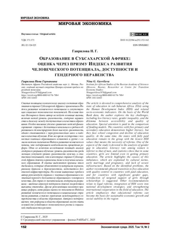 Статья: ОБРАЗОВАНИЕ В СУБСАХАРСКОЙ АФРИКЕ: ОЦЕНКА ЧЕРЕЗ ПРИЗМУ ИНДЕКСА РАЗВИТИЯ ЧЕЛОВЕЧЕСКОГО ПОТЕНЦИАЛА, ДОСТУПНОСТИ И ГЕНДЕРНОГО НЕРАВЕНСТВА