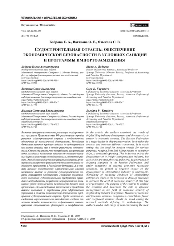 Статья: СУДОСТРОИТЕЛЬНАЯ ОТРАСЛЬ: ОБЕСПЕЧЕНИЕ ЭКОНОМИЧЕСКОЙ БЕЗОПАСНОСТИ В УСЛОВИЯХ САНКЦИЙ И ПРОГРАММЫ ИМПОРТОЗАМЕЩЕНИЯ