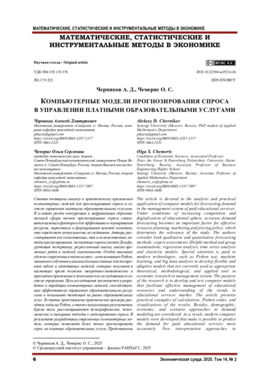 Статья посвящена анализу и практическому применению компьютерных моделей для прогнозирования спроса в системе управления платными образовательными услугами. В условиях роста конкуренции и цифровизации образовательной сферы точное прогнозирование спроса становится важным фактором для эффективного планирования ресурсов, маркетинга и формирования ценовой политики, что определяет актуальность исследования. Авторы рассматривают как качественные, так и количественные методы прогнозирования: экспертные оценки (метод Дельфи, групповая экспертиза), регрессионный анализ, анализ временных рядов и моделей эластичности. Особое внимание уделено современным технологиям - использованию Python, машинного обучения и анализа больших данных для построения гибких и адаптивных моделей, которые получают в настоящее время должное теоретико-методическое и прикладное применение в экономических исследованиях в системе управления. Цель исследования заключается в разработке и апробации компьютерных моделей, способствующих эффективному управлению образовательными ресурсами и пониманию тенденций на рынке образовательных услуг. В статье представлены практические примеры расчётов, коды на Python, а также визуализации результатов. Кроме того, рассматриваются демографические, экономические и сценарные подходы к моделированию спроса. В результате разработаны современные компьютерные модели, которые позволяют более точно прогнозировать спрос на платные образовательные услуги. Представлены новые подходы к интерпретации результатов прогнозирования, что способствует повышению эффективности управления образовательными ресурсами. Статья подчёркивает важность комплексного и технологически подкреплённого подхода к прогнозированию как основного инструмента развития образовательной организации.