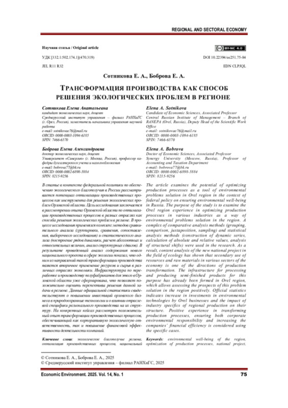 В статье в контексте федеральной политики по обеспечению экологического благополучия в России рассматривается потенциал оптимизации производственных процессов как инструмента для решения экологических проблем Орловской области. Цель исследования заключается в рассмотрении опыта Орловской области по оптимизации производственных процессов в разных отраслях как способа решения экологических проблем в регионе. В процессе исследования применялся комплекс методов сравнительного анализа (группировки, сравнения, сопоставления, выборочного исследования) и статистического анализа (построение рядов динамики, расчет абсолютных и относительных величин, анализ структурных сдвигов). В результате проведенный анализ содержания нового национального проекта в сфере экологии показал, что одним из направлений такой трансформации производства является вторичное применение ресурсов и сырья в различных отраслях экономики. Инфраструктура по переработке и производству полуфабрикатов для этого в Орловской области уже сформирована, что позволяет положительно оценить перспективы решения данной задачи в регионе. Данные официальной статистики свидетельствуют о повышении инвестиций орловского бизнеса в природоохранные технологии и о влиянии отраслевой специфики регионального производства на их структуру. На конкретных кейсах рассмотрен положительный опыт трансформации производственных процессов, обеспечивающий как корпоративную экологическую ответственность, так и повышение финансовой эффективности деятельности компаний.