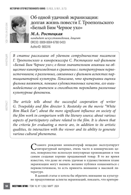 В статье рассказано об удачном сотрудничестве писателя Г. Троепольского и кинорежиссера С. Ростоцкого над фильмом «Белый Бим Черное ухо»; о более значительном влиянии на общество кинопроизведения в сравнении с литературным первоисточником; о различных, связанных с фильмом аспектах партиципаторной культуры. Показано, что критериями оценки фильма являются, помимо художественных качеств, его взаимодействие со зрителем и способность порождать различные культурные феномены.