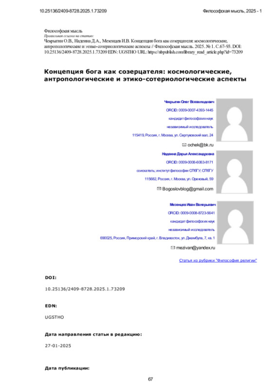 Статья: Концепция бога как созерцателя: космологические, антропологические и этико-сотериологические аспекты