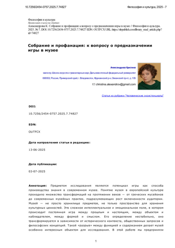 Статья: Собрание и профанация: к вопросу о предназначении игры в музее