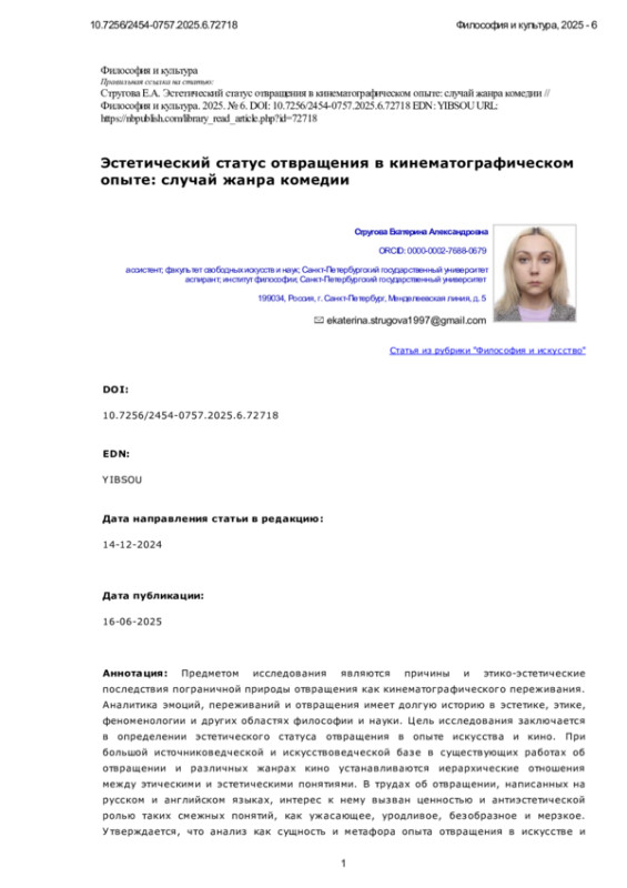 Предметом исследования являются причины и этико-эстетические последствия пограничной природы отвращения как кинематографического переживания. Аналитика эмоций, переживаний и отвращения имеет долгую историю в эстетике, этике, феноменологии и других областях философии и науки. Цель исследования заключается в определении эстетического статуса отвращения в опыте искусства и кино. При большой источниковедческой и искусствоведческой базе в существующих работах об отвращении и различных жанрах кино устанавливаются иерархические отношения между этическими и эстетическими понятиями. В трудах об отвращении, написанных на русском и английском языках, интерес к нему вызван ценностью и антиэстетической ролью таких смежных понятий, как ужасающее, уродливое, безобразное и мерзкое. Утверждается, что анализ как сущность и метафора опыта отвращения в искусстве и кино отражает эстетическую чувствительность к различным граням объекта и подкрепляет этическую оценку зрителя. Метод исследования - анализ отвращения в кино и сравнительное рассмотрение этики и эстетики отвратительного в комедиях 1960-2020-х гг. С опорой на философскую, экспериментальную и психологическую эстетику пересматривается тезис о несовместимости отвращения с эстетикой и этикой и о том, что отвратительное - это жанрообразующий элемент преимущественно фильмов ужасов. Научная новизна исследования выражается тезисом о том, что эстетическое отвращение, прежде всего, в жанровом кино приобретает форму анализа, а причины интенсивности и этико-эстетический эффект отвращения вызваны его спецификой. Она состоит в отсутствии у данного переживания собственного содержания помимо отвратительности самого объекта или по сравнению с иными эстетическими чувствами. Делается вывод о том, что, если в ряде направлений современной этики временное промедление как моральное бездействие приравнивается к проступку, то в теории и практике киноанализа на созерцание и эстетическое суждение об изобразительном и звуковом решении фильмов как об отвратительных нужно время. Подчас комедии второй половины XX в. становятся хрестоматийными и культовыми не в первоначальной рецепции, а спустя более полувека после выхода в прокат.