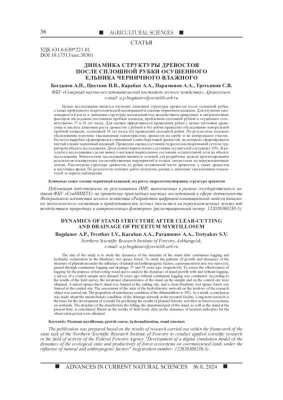 Статья: ДИНАМИКА СТРУКТУРЫ ДРЕВОСТОЯ ПОСЛЕ СПЛОШНОЙ РУБКИ ОСУШЕННОГО ЕЛЬНИКА ЧЕРНИЧНОГО ВЛАЖНОГО
