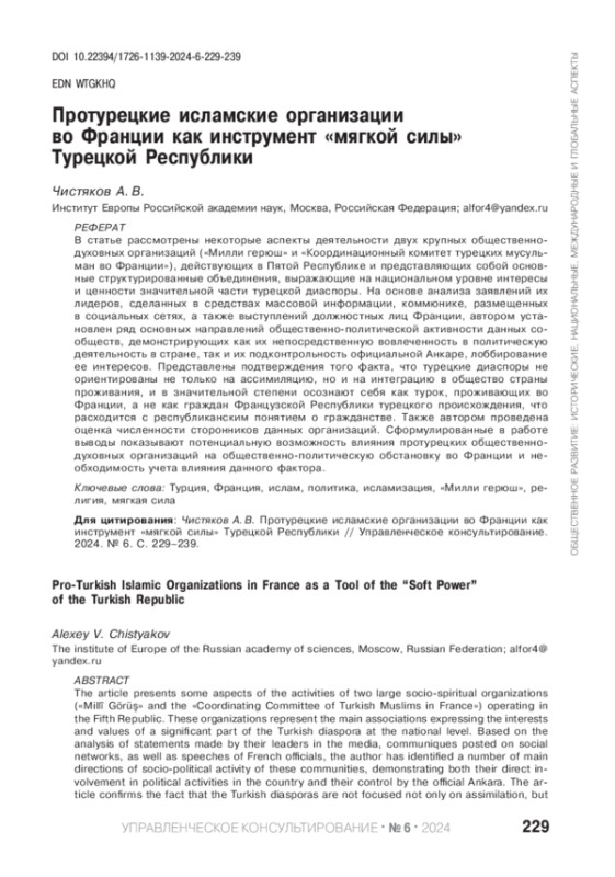 В статье рассмотрены некоторые аспекты деятельности двух крупных общественно-духовных организаций («Милли герюш» и «Координационный комитет турецких мусульман во Франции»), действующих в Пятой Республике и представляющих собой основные структурированные объединения, выражающие на национальном уровне интересы и ценности значительной части турецкой диаспоры. На основе анализа заявлений их лидеров, сделанных в средствах массовой информации, коммюнике, размещенных в социальных сетях, а также выступлений должностных лиц Франции, автором установлен ряд основных направлений общественно-политической активности данных сообществ, демонстрирующих как их непосредственную вовлеченность в политическую деятельность в стране, так и их подконтрольность официальной Анкаре, лоббирование ее интересов. Представлены подтверждения того факта, что турецкие диаспоры не ориентированы не только на ассимиляцию, но и на интеграцию в общество страны проживания, и в значительной степени осознают себя как турок, проживающих во Франции, а не как граждан Французской Республики турецкого происхождения, что расходится с республиканским понятием о гражданстве. Также автором проведена оценка численности сторонников данных организаций. Сформулированные в работе выводы показывают потенциальную возможность влияния протурецких общественно-духовных организаций на общественно-политическую обстановку во Франции и необходимость учета влияния данного фактора.