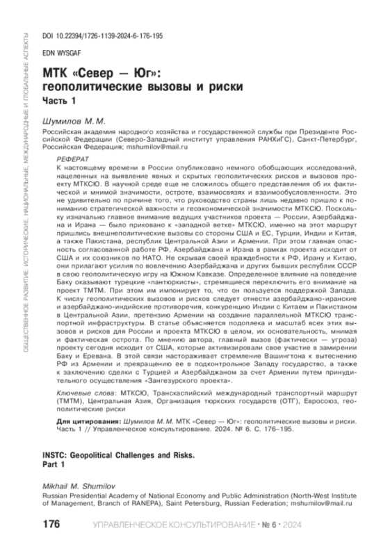 Статья: МТК "СЕВЕР - ЮГ": ГЕОПОЛИТИЧЕСКИЕ ВЫЗОВЫ И РИСКИ. ЧАСТЬ 1