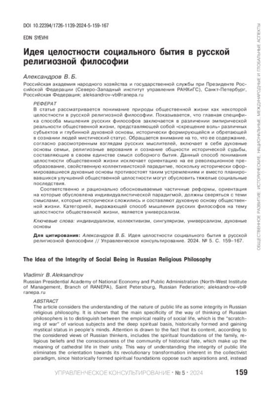 Статья: ИДЕЯ ЦЕЛОСТНОСТИ СОЦИАЛЬНОГО БЫТИЯ В РУССКОЙ РЕЛИГИОЗНОЙ ФИЛОСОФИИ