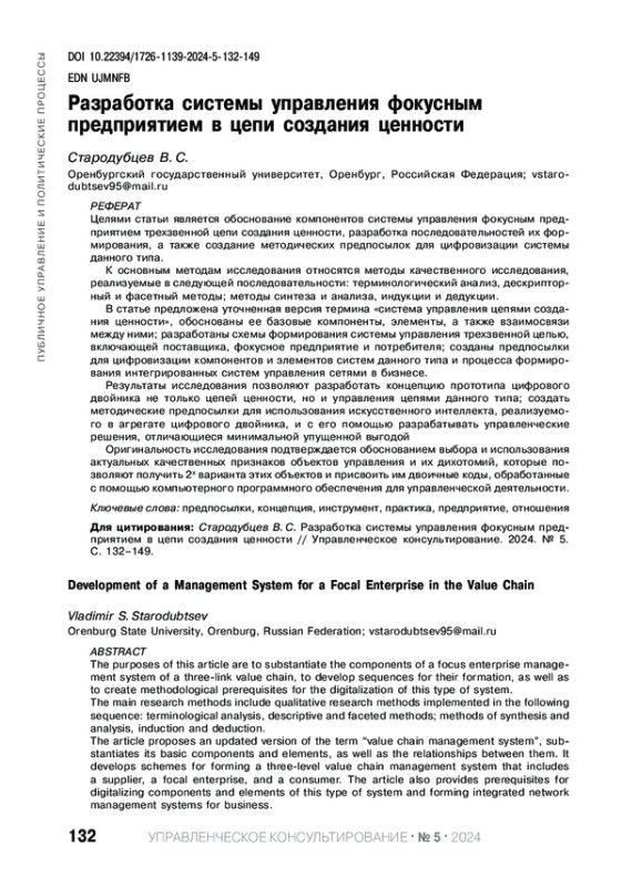 Целями статьи является обоснование компонентов системы управления фокусным предприятием трехзвенной цепи создания ценности, разработка последовательностей их формирования, а также создание методических предпосылок для цифровизации системы данного типа. К основным методам исследования относятся методы качественного исследования, реализуемые в следующей последовательности: терминологический анализ, дескрипторный и фасетный методы; методы синтеза и анализа, индукции и дедукции. В статье предложена уточненная версия термина «система управления цепями создания ценности», обоснованы ее базовые компоненты, элементы, а также взаимосвязи между ними; разработаны схемы формирования системы управления трехзвенной цепью, включающей поставщика, фокусное предприятие и потребителя; созданы предпосылки для цифровизации компонентов и элементов систем данного типа и процесса формирования интегрированных систем управления сетями в бизнесе. Результаты исследования позволяют разработать концепцию прототипа цифрового двойника не только цепей ценности, но и управления цепями данного типа; создать методические предпосылки для использования искусственного интеллекта, реализуемого в агрегате цифрового двойника, и с его помощью разрабатывать управленческие решения, отличающиеся минимальной упущенной выгодой. Оригинальность исследования подтверждается обоснованием выбора и использования актуальных качественных признаков объектов управления и их дихотомий, которые позволяют получить 2х варианта этих объектов и присвоить им двоичные коды, обработанные с помощью компьютерного программного обеспечения для управленческой деятельности.