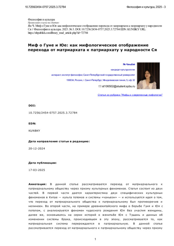 В данной статье рассматривается переход от матриархального к патриархальному обществу через призму культурных феноменов. Статья состоит из двух частей. В первой части дается характеристика двух специфических культурных феноменов в Китае - культа тотемов и системы «чаньвэн» - и используется идея о том, что переход от матриархального общества к патриархальному был противоречив и нелинеен. Во второй части, на примере древнекитайского мифа о борьбе Гуня и Юя с потопом, с анализируется феномен чудесного рождения Юя без участия женщины, далее же, основываясь на серии историй о женитьбе Юя с Тушань и данных об изменении системы брака, происходившем в эту эпоху, рассматривается то, как матриархальная система перерождается в патриархальную. В данной статье рассматривается переход от матриархального к патриархальному обществу через призму культурных феноменов. Во-первых, в статье дается характеристика двух специфических культурных феноменов в Китае - культа тотемов и системы «чаньвэн» - и используется идея о том, что переход от матриархального общества к патриархальному был противоречив и нелинеен. Во-вторых, статья основываясь на серии историй о женитьбе Юя и Тушань и данных об изменении системы брака, происходившем в эту эпоху, рассматривается то, как матриархальная система перерождается в патриархальную. Также установлены мужское репродуктивное право, право передачи потомкам отцовской фамилии и наследственное право отца и сына и т. д., что завершило переход народности Ся от матриархата к патриархату и становление классового общества.