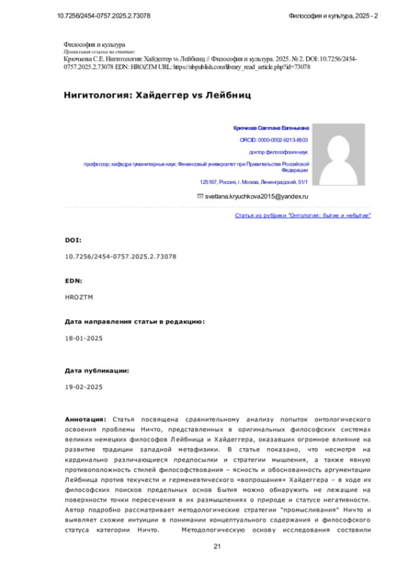 Статья посвящена сравнительному анализу попыток онтологического освоения проблемы Ничто, представленных в оригинальных философских системах великих немецких философов Лейбница и Хайдеггера, оказавших огромное влияние на развитие традиции западной метафизики. В статье показано, что несмотря на кардинально различающиеся предпосылки и стратегии мышления, а также явную противоположность стилей философствования - ясность и обоснованность аргументации Лейбница против текучести и герменевтического «вопрошания» Хайдеггера - в ходе их философских поисков предельных основ Бытия можно обнаружить не лежащие на поверхности точки пересечения в их размышлениях о природе и статусе негативности. Автор подробно рассматривает методологические стратегии “промысливания” Ничто и выявляет схожие интуиции в понимании концептуального содержания и философского статуса категории Ничто. Методологическую основу исследования составили сравнительно-исторический и герменевтический методы, а также контент-анализ и метод экзистенциальной аналитики. Новизна исследования заключается в выделении конкретных точек пересечения Лейбница и Хайдеггера в философском дискурсе о природе негативности. Особо подчеркивается, что несмотря на различие стилей философствования и рассмотрения Ничто через разные отношения («Ничто - Бог», «Ничто- сущее», «Ничто - Бытие», «Ничто- Dasein»), мы имеем дело с «неприсутствующим присутствием Ничто», где последнее предстает не как отрицание или «лишенность», а наполняется позитивным содержанием. Схожесть философствования Лейбница и Хайдеггера, традиционно относимых к разным философским течениям, проявилась также в их поисках новых терминов при попытке реформирования языка традиционной метафизики. Показано, что историко-философский схематизм с его «-измами» и «-логиями» не всегда продуктивен, т. к. упрощает и затеняет некоторые не лежащие на поверхности аспекты, важные для понимания идей того или иного философа. Так идейная близость систем Лейбница и Хайдеггера обнаруживается в том числе и в той страстности, с которой они философствуют. Проникая различными методами в историю метафизики в поисках ответа на вопрос «Существует ли несуществующее?», они тем самым поддерживают и развивают историческую традицию метафизики, как «philosophia perennis», обращаясь с ней как с вечным настоящим.