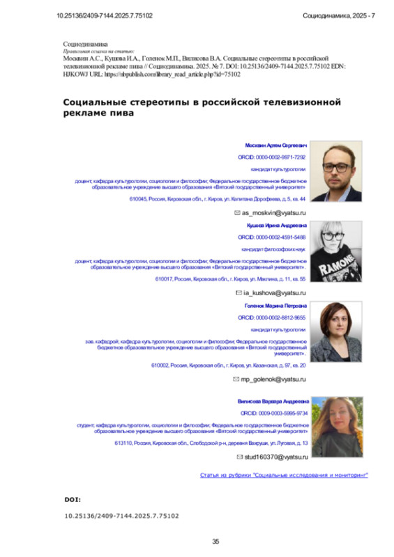 Пиво, как один из наиболее популярных алкогольных напитков, занимает значительное место в социальной и культурной жизни России. Оно не только отражает потребительские предпочтения, но и является важным элементом коллективной идентичности, влияющим на формирование определённых поведенческих моделей и стереотипов. В контексте общего алкогольного потребления пиво нередко воспринимается как «социально приемлемый» напиток, сопровождающий повседневное общение и досуг, что усиливает его символическое значение в культуре страны. Изучение способов его репрезентации в медиаконтенте, особенно в рекламе, позволяет глубже понять особенности социальной реальности, систему культурных норм, ценностей и массовых представлений, присущих российскому обществу. Предметом настоящего исследования являются социальные стереотипы, а целью - выявление и анализ динамики их использования в российской рекламе пива. В ходе работы методом контент-анализа было проанализировано 92 телевизионных рекламных ролика о пиве, выпущенных в период с 1990-х по 2020-е гг. Критерием отбора телевизионных роликов являлось наличие в рекламе упоминания пивной продукции. Анализ рекламы пива в России выявил, что почти в половине роликов стереотипы отсутствуют, однако их использование возросло с 2010-х годов. В ходе работы проведена классификация социальных стереотипов: к наиболее распространённым отнесены национальные и физиологические, а к наименее распространённым - гендерные, возрастные, стереотипы употребления напитка и взаимодействия. Говоря о временной динамике, наибольший рост зафиксирован у национальных и возрастных стереотипов, особенно с участием пожилых актёров. Гендерные стереотипы остаются стабильными, но мужские образы утрачивают доминирование. Стереотипы употребления и взаимодействия, а также физиологические демонстрируют отрицательную динамику. Научная новизна исследования состоит в том, что в отличие от ранее проведённых работ, посвящённых анализу социальных стереотипов в рекламе в целом, в данной работе предметом социологического анализа впервые выступает именно телевизионная реклама пива. Исследование способствует развитию представлений о распространенности социальных стереотипов в российском обществе. Практическая значимость работы заключается в возможности использования полученных данных при разработке социальной рекламы, медиаполитик и регулятивных норм, направленных на формирование более ответственного и этичного образа потребления алкогольных напитков.