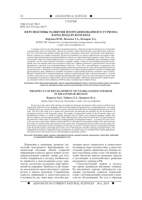 Статья: ПЕРСПЕКТИВЫ РАЗВИТИЯ НЕОРГАНИЗОВАННОГО ТУРИЗМА В КРАСНОДАРСКОМ КРАЕ