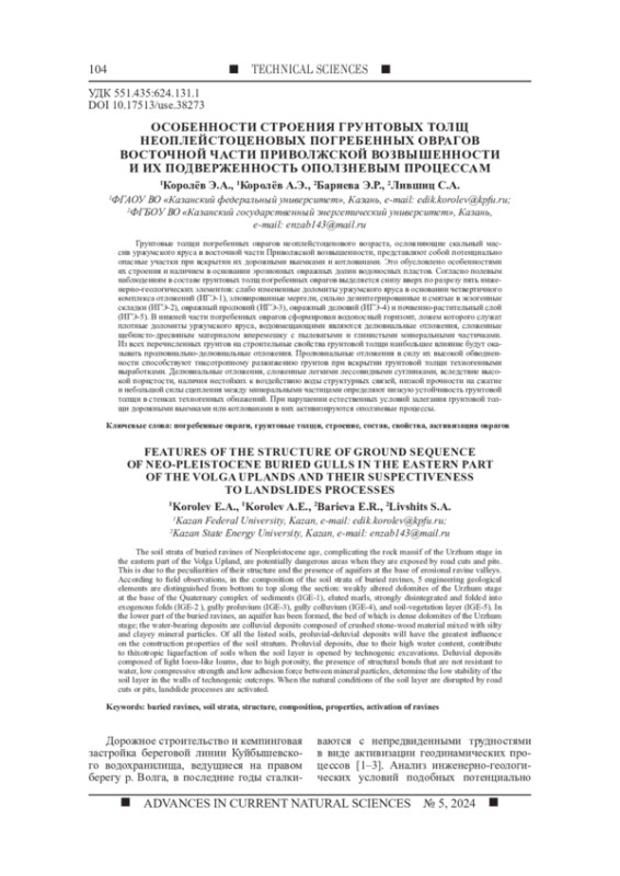 Статья: ОСОБЕННОСТИ СТРОЕНИЯ ГРУНТОВЫХ ТОЛЩ НЕОПЛЕЙСТОЦЕНОВЫХ ПОГРЕБЕННЫХ ОВРАГОВ ВОСТОЧНОЙ ЧАСТИ ПРИВОЛЖСКОЙ ВОЗВЫШЕННОСТИ И ИХ ПОДВЕРЖЕННОСТЬ ОПОЛЗНЕВЫМ ПРОЦЕССАМ