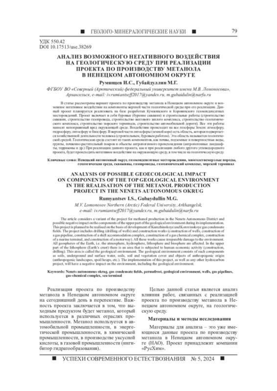 В статье рассмотрены вариант проекта по производству метанола в Ненецком автономном округе и возможное негативное воздействие на компоненты верхней части геологической среды при его реализации. Данный проект планируется реализовать на базе разработки Кумжинского и Коровинского газоконденсатных месторождений. Проект включает в себя буровые (бурение скважин) и строительные работы (строительство скважин, строительство газопровода, строительство вахтового жилого комплекса, строительство газохимического комплекса, строительство морского терминала, строительство автомобильной дороги). Все эти работы наносят непоправимый вред окружающей среде. Воздействие происходит на все геосферы Земли: атмосферу, гидросферу, литосферу и биосферу. В верхней части литосферы (земной коре) есть область, которая подвергается хозяйственной деятельности человека (строительным, буровым работам). Эта область называется геологической средой. Геологическая среда состоит из таких компонентов, как почвы, подземные и поверхностные воды, грунты, почвенно-растительный покров и объекты антропогенного происхождения (антропогенные ландшафты, терриконы и др.) При реализации данного проекта, как и при реализации любого другого углеводородного проекта, будет происходить негативное воздействие на окружающую среду, в том числе на геологическую среду.