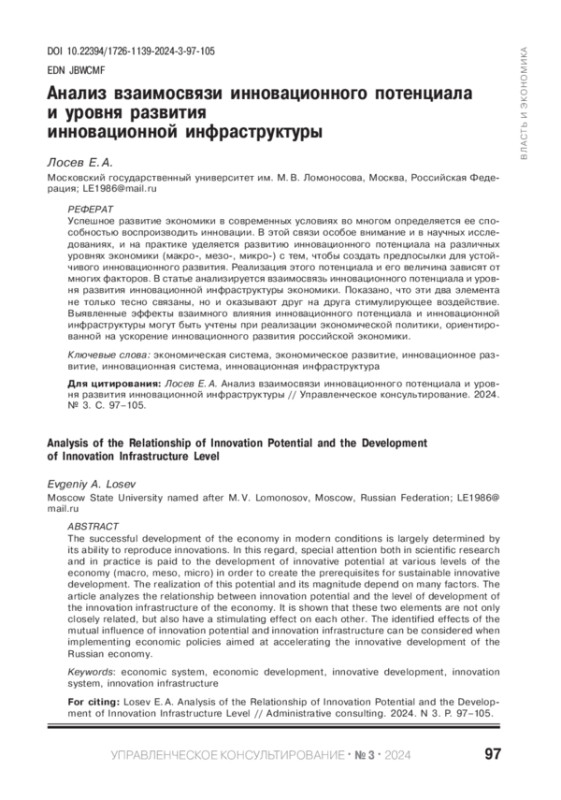 Успешное развитие экономики в современных условиях во многом определяется ее способностью воспроизводить инновации. В этой связи особое внимание и в научных исследованиях, и на практике уделяется развитию инновационного потенциала на различных уровнях экономики (макро-, мезо-, микро-) с тем, чтобы создать предпосылки для устойчивого инновационного развития. Реализация этого потенциала и его величина зависят от многих факторов. В статье анализируется взаимосвязь инновационного потенциала и уровня развития инновационной инфраструктуры экономики. Показано, что эти два элемента не только тесно связаны, но и оказывают друг на друга стимулирующее воздействие. Выявленные эффекты взаимного влияния инновационного потенциала и инновационной инфраструктуры могут быть учтены при реализации экономической политики, ориентированной на ускорение инновационного развития российской экономики.