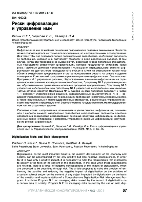 Статья: РИСКИ ЦИФРОВИЗАЦИИ И УПРАВЛЕНИЕ ИМИ
