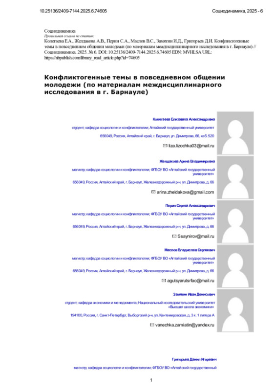 Статья: Конфликтогенные темы в повседневном общении молодежи (по материалам междисциплинарного исследования в г. Барнауле)