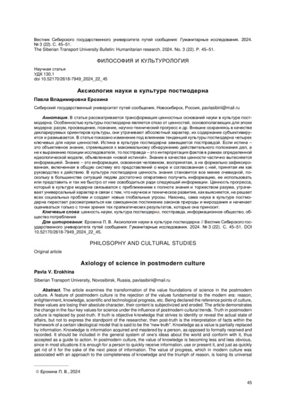 Статья: АКСИОЛОГИЯ НАУКИ В КУЛЬТУРЕ ПОСТМОДЕРНА