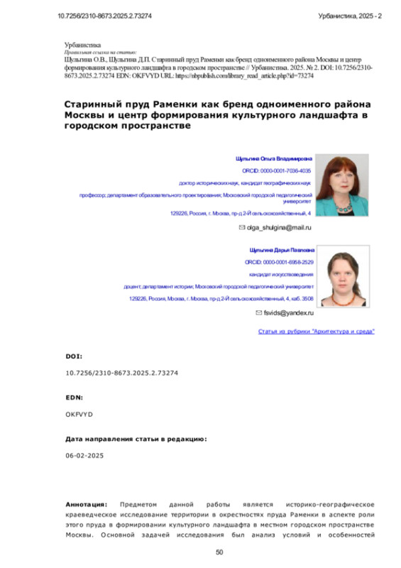 Статья: Старинный пруд Раменки как бренд одноименного района Москвы и центр формирования культурного ландшафта в городском пространстве
