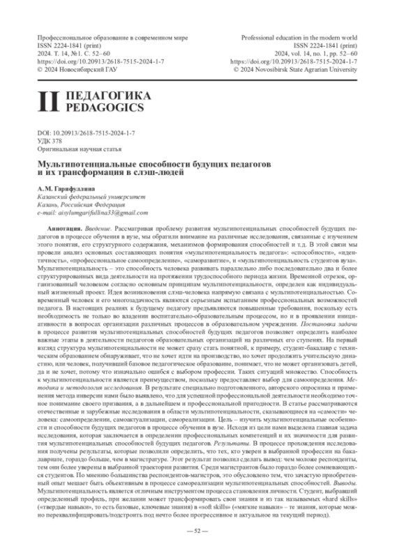 Статья: Мультипотенциальные способности будущих педагогов и их трансформация в слэш-людей