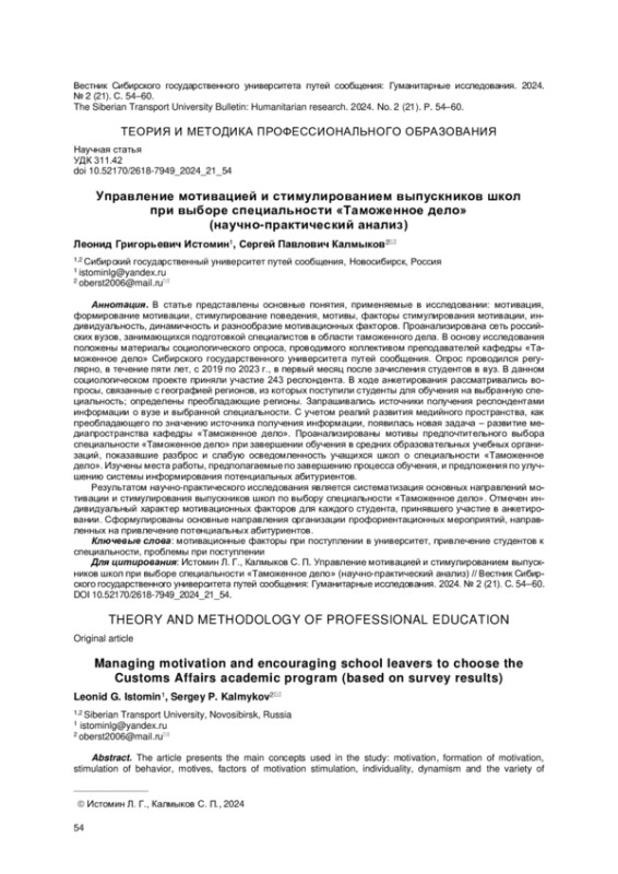 В статье представлены основные понятия, применяемые в исследовании: мотивация, формирование мотивации, стимулирование поведения, мотивы, факторы стимулирования мотивации, индивидуальность, динамичность и разнообразие мотивационных факторов. Проанализирована сеть российских вузов, занимающихся подготовкой специалистов в области таможенного дела. В основу исследования положены материалы социологического опроса, проводимого коллективом преподавателей кафедры «Таможенное дело» Сибирского государственного университета путей сообщения. Опрос проводился регулярно, в течение пяти лет, с 2019 по 2023 г., в первый месяц после зачисления студентов в вуз. В данном социологическом проекте приняли участие 243 респондента. В ходе анкетирования рассматривались вопросы, связанные с географией регионов, из которых поступили студенты для обучения на выбранную специальность; определены преобладающие регионы. Запрашивались источники получения респондентами информации о вузе и выбранной специальности. С учетом реалий развития медийного пространства, как преобладающего по значению источника получения информации, появилась новая задача - развитие медиапространства кафедры «Таможенное дело». Проанализированы мотивы предпочтительного выбора специальности «Таможенное дело» при завершении обучения в средних образовательных учебных организаций, показавшие разброс и слабую осведомленность учащихся школ о специальности «Таможенное дело». Изучены места работы, предполагаемые по завершению процесса обучения, и предложения по улучшению системы информирования потенциальных абитуриентов.