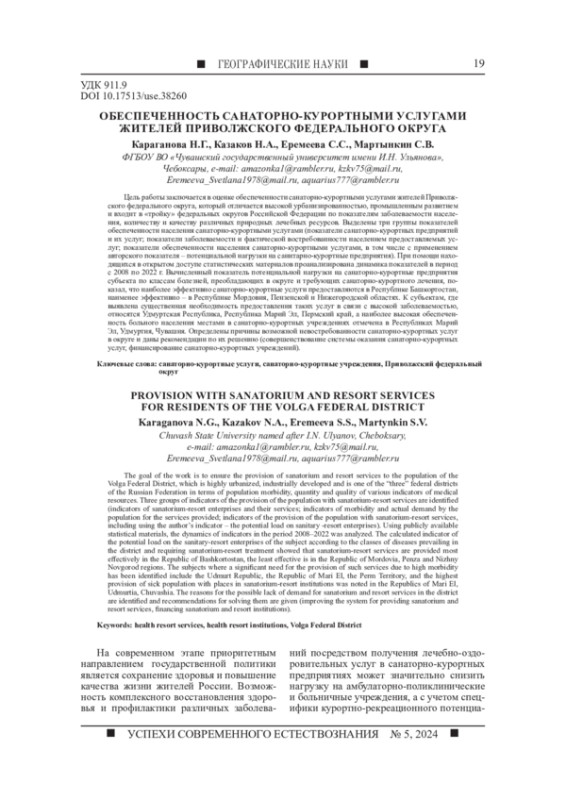 Цель работы заключается в оценке обеспеченности санаторно-курортными услугами жителей Приволжского федерального округа, который отличается высокой урбанизированностью, промышленным развитием и входит в «тройку» федеральных округов Российской Федерации по показателям заболеваемости населения, количеству и качеству различных природных лечебных ресурсов. Выделены три группы показателей обеспеченности населения санаторно-курортными услугами (показатели санаторно-курортных предприятий и их услуг; показатели заболеваемости и фактической востребованности населением предоставляемых услуг; показатели обеспеченности населения санаторно-курортными услугами, в том числе с применением авторского показателя - потенциальной нагрузки на санитарно-курортные предприятия). При помощи находящихся в открытом доступе статистических материалов проанализирована динамика показателей в период с 2008 по 2022 г. Вычисленный показатель потенциальной нагрузки на санаторно-курортные предприятия субъекта по классам болезней, преобладающих в округе и требующих санаторно-курортного лечения, показал, что наиболее эффективно санаторно-курортные услуги предоставляются в Республике Башкортостан, наименее эффективно - в Республике Мордовия, Пензенской и Нижегородской областях. К субъектам, где выявлена существенная необходимость предоставления таких услуг в связи с высокой заболеваемостью, относятся Удмуртская Республика, Республика Марий Эл, Пермский край, а наиболее высокая обеспеченность больного населения местами в санаторно-курортных учреждениях отмечена в Республиках Марий Эл, Удмуртия, Чувашия. Определены причины возможной невостребованности санаторно-курортных услуг в округе и даны рекомендации по их решению (совершенствование системы оказания санаторно-курортных услуг, финансирование санаторно-курортных учреждений).