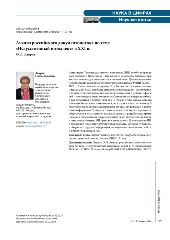 Статья: Анализ российского документопотока по теме «Искусственный интеллект» в XXI в.