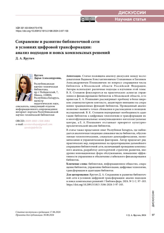 Статья: Сохранение и развитие библиотечной сети в условиях цифровой трансформации: анализ подходов и поиск комплексных решений