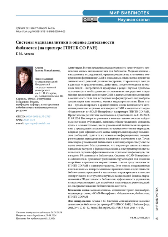 Статья: Системы медиааналитики в оценке деятельности библиотек (на примере ГПНТБ СО РАН)