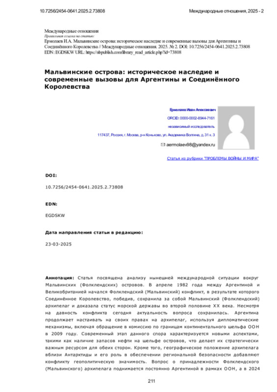 Статья посвящена анализу нынешней международной ситуации вокруг Мальвинских (Фолклендских) островов. В апреле 1982 года между Аргентиной и Великобританией начался Фолклендский (Мальвинский) конфликт, в результате которого Соединённое Королевство, победив, сохранила за собой Мальвинский (Фолклендский) архипелаг и доказала статус морской державы во второй половине ХХ века. Несмотря на давность конфликта сегодня актуальность вопроса сохранилась. Аргентина продолжает настаивать на своих правах на архипелаг, используя дипломатические механизмы, включая обращение в комиссию по границам континентального шельфа ООН в 2009 году. Современный этап данного спора характеризуется новыми аспектами, такими как наличие запасов нефти на шельфе островов, что делает их стратегически важным ресурсом для обеих сторон. Кроме того, географическое положение архипелага вблизи Антарктиды и его роль в обеспечении региональной безопасности добавляют конфликту геополитическую значимость. Вопрос о принадлежности Фолклендского (Мальвинского) архипелага поднимается постоянно Аргентиной в рамках ООН, а в 2024 году правительство Аргентины заявило, что желает возобновить двусторонние переговоры о решении статуса островов. Для достижения цели исследования используются такие методологические инструменты как - эмпирические для анализа национальных документов и резолюций ООН, общенаучные - сравнительный анализ для исследования доводов Аргентины и Великобритании по вопросу принадлежности архипелага и логические - для формулирования конфликтного потенциала и выводов исследования. В результате исследования были сделаны следующие выводы. Вопрос принадлежности Мальвинских островов остаётся актуальным в современных реалиях международных отношений, приобретая новые аспекты: экономический, внутриполитический, геополитический. Практически все латиноамериканские страны поддерживают Аргентину или нейтрально выступают в её поддержку. При этом в мире наблюдается усталость от данного территориального диспута, хотя многие страны обеспокоены сопутствующими проблемами, возникающими вокруг архипелага. Среди данных проблем отмечается наличие британских военно-морских баз на островах, что является раздражающим фактором для стран, чьи границы находятся в Южной Атлантике, например Бразилии и Уругвая. В связи с тем, что данный вопрос является крайне многослойным и представляет собой сложный клубок исторических, экономических, геополитических факторов, его решение в обозримом будущем невозможно.